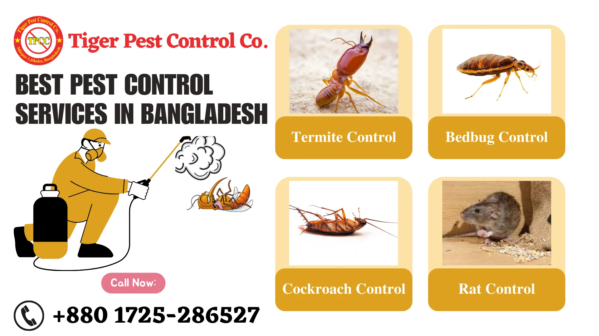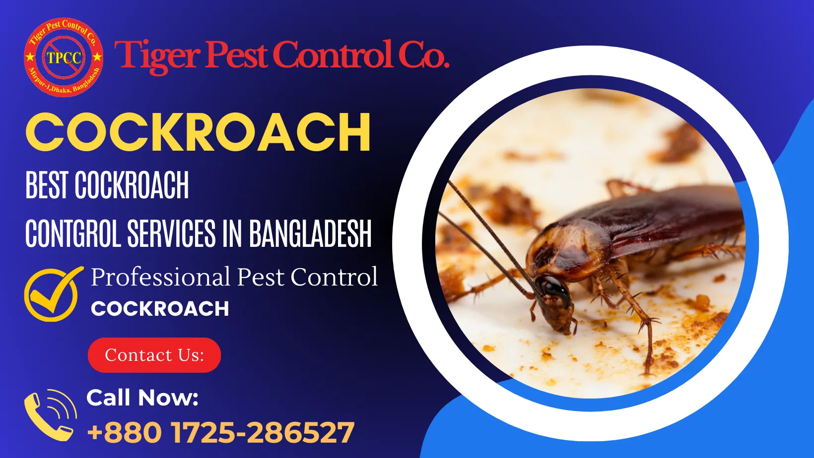 আমরা আমাদের বাসায়, কর্মস্থলে, ব্যবসায়িক প্রতিষ্ঠান বা অফিসে অনেক তেলাপোকা, ইঁদুর,সাপ এবং বিভিন্ন প্রকার কীট-পতঙ্গের আক্রমণের সমস্যার সম্মুখীন হচ্ছি। এই বিপর্যস্ততা আমাদের স্বাভাবিকভাবেই ক্ষতি করছে। তাই, এগুলো নির্মূল করা অত্যন্ত গুরুত্বপূর্ণ । টাইগার পেস্ট কন্টোল কো. - ১৯৯৫ সাল থেকে অত্যন্ত সুনামের সাথে পোকামাকড় নিয়ন্ত্রণের সেবা প্রদান করে আসছে,